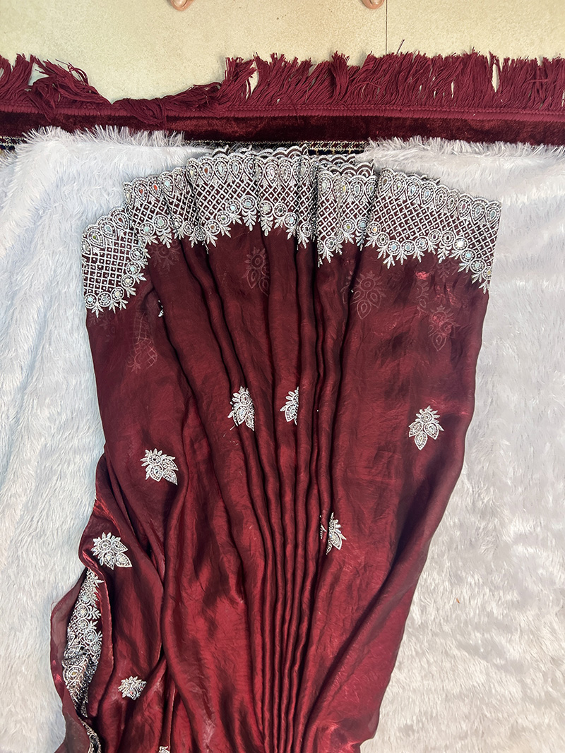 A premium Jimichu Soft Silk Saree with Heavy Stone Work, hand-crafted with rich traditional detailing. The saree is made using a soft silk blend, giving it a smooth, lightweight, and comfortable drape with a natural sheen.