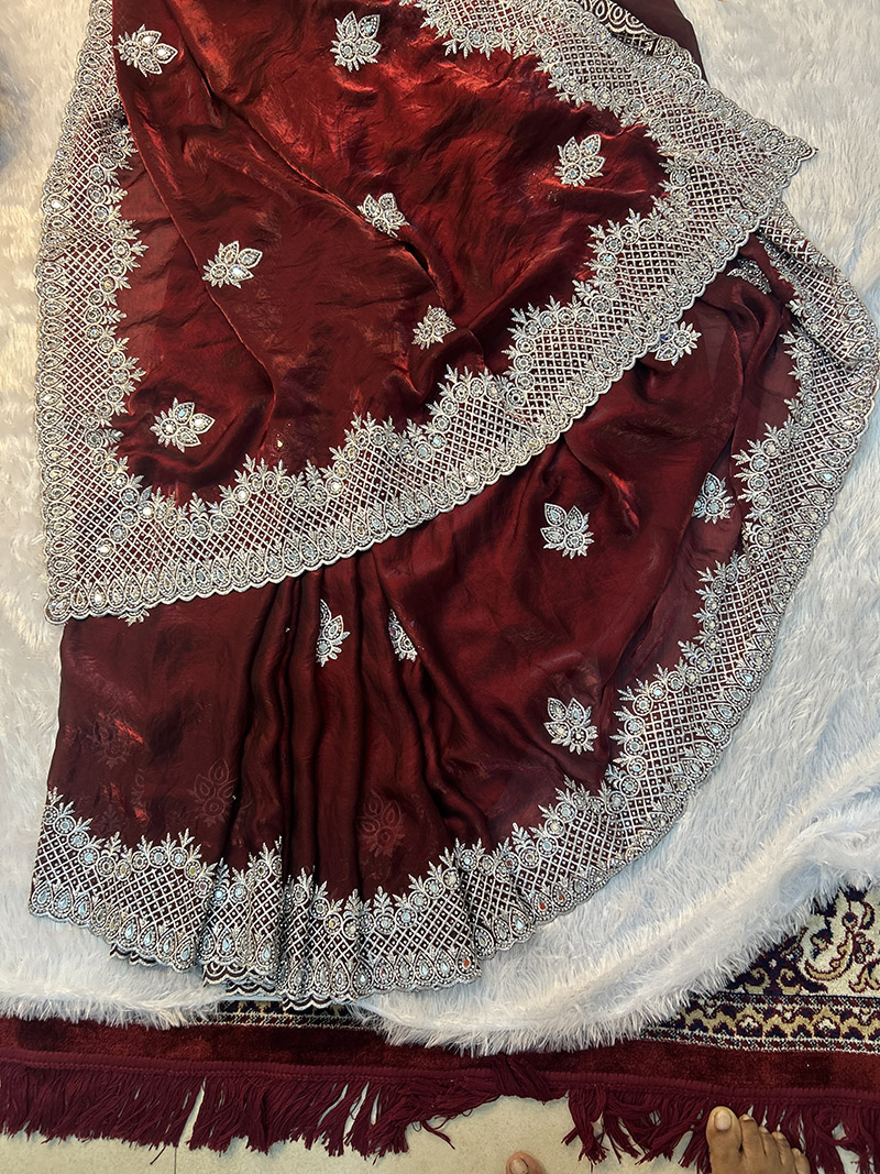 - Saree Work: Zari-woven base with stone and bead buta work