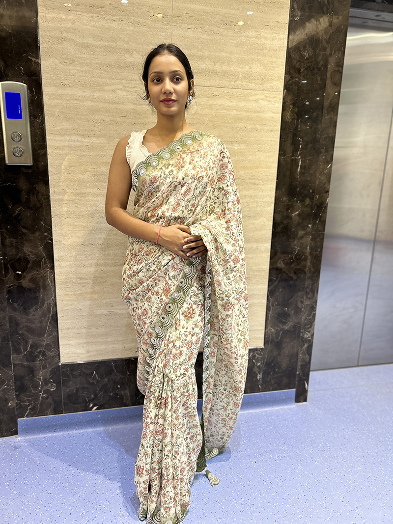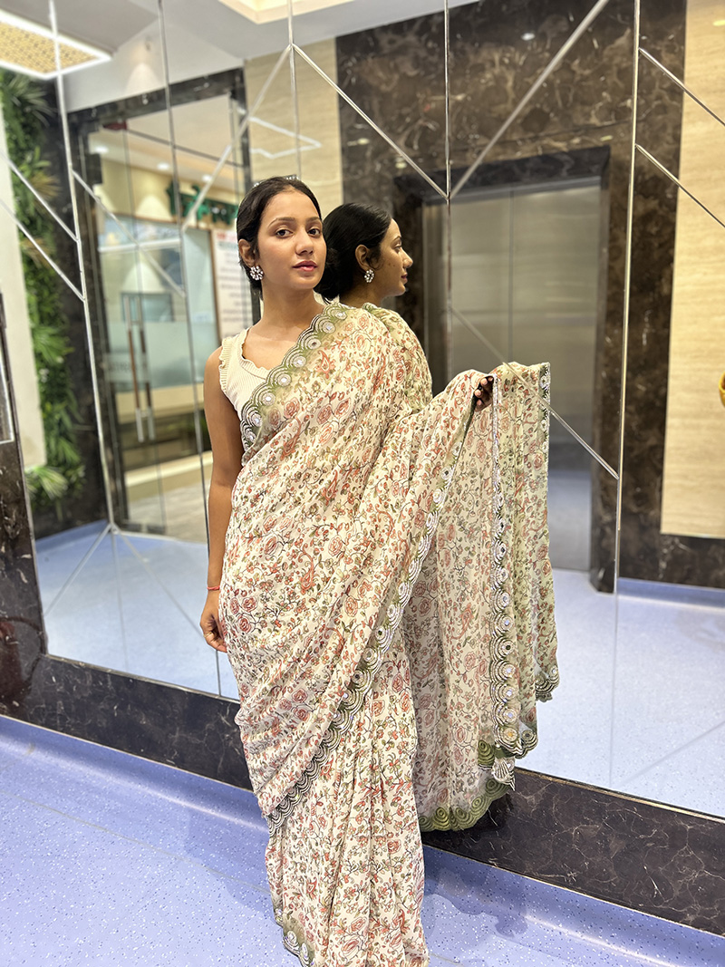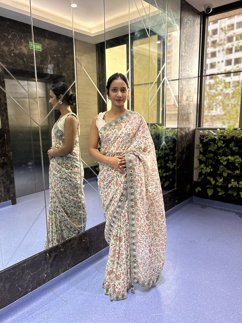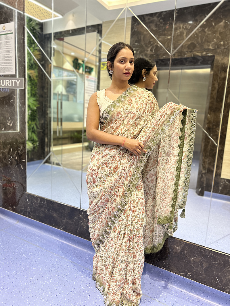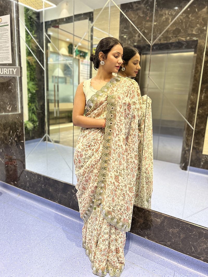 - Saree Work: High-definition floral print spread evenly across the chiffon base